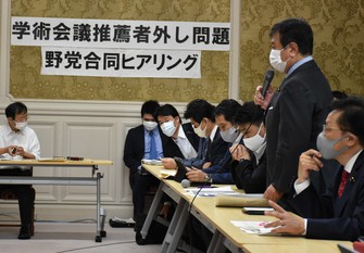 「日本学術会議」が推薦した新会員6人について、菅義偉首相が任命しなかった問題について、野党合同ヒアリングが2日、国会内で開かれた。1983年に国会で、当時の中曽根康弘首相が「実態は各学会が推薦権を握っている。政府の行為は形式的行為と考えれば、学問の自主独立はあくまで保障される」と、首相の任命拒否権を事実上否定する答弁をしたこととの整合性などが追求された。詳報は以下の通り。【宮原健太】