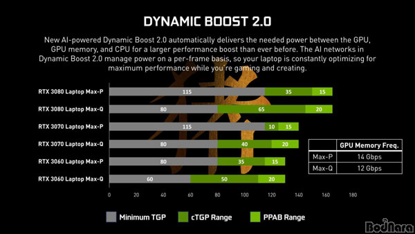 동일한 GPU가 사용되었음에도 노트북 설계에 따라 소비전력(TGP) 설계와 클럭 설정이 다르며, 이는 유의미한 성능 차이로 이어진다. 모바일용 RTX 3070이 사용된 노트북은 설계에 따라 GPU 성능이 약 30% 가량 차이나는 사실이 테스트로 확인되기도 했다.