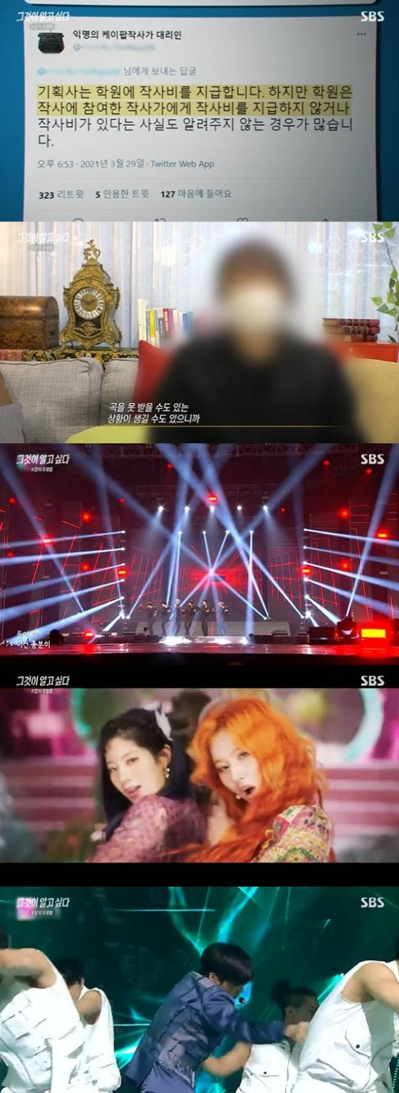 8일 오후 방송된 SBS '그것이 알고 싶다'는 'K팝의 유령들 - 그 히트송은 누가 만들었는가' 편이 전해졌다. 대형기획사와 연루된 '유령작사가'의 정체, K팝 업계의 부조리한 관행 등을 추적했다.